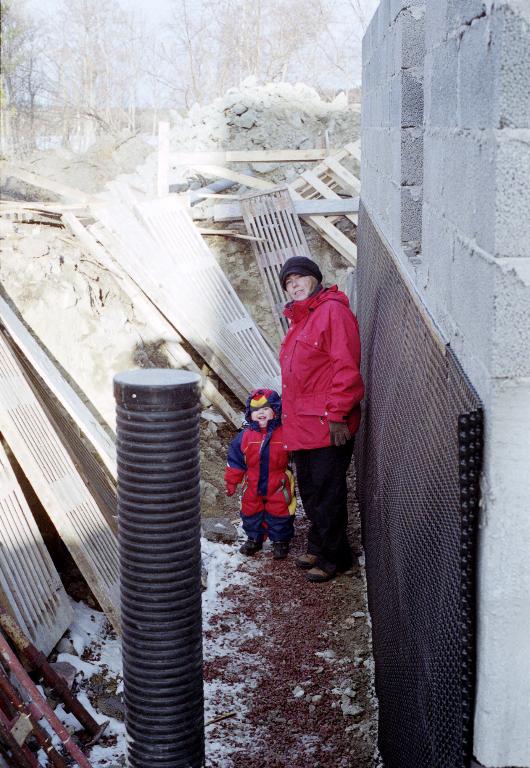 På bilderna ovan ser du byggherren i aktion med att trava Lecablock samt en vy av källaren.