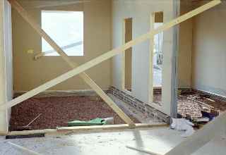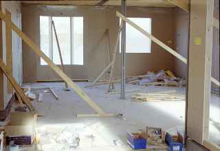 View from the entrance, living room (center) dining room (left) and kitchen (right).
