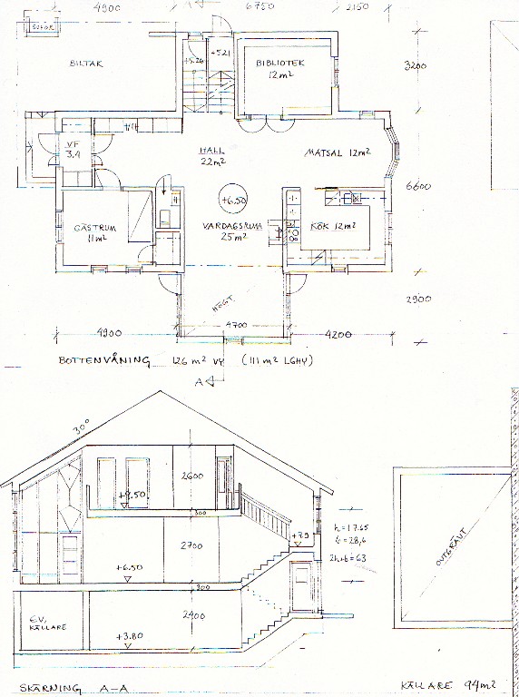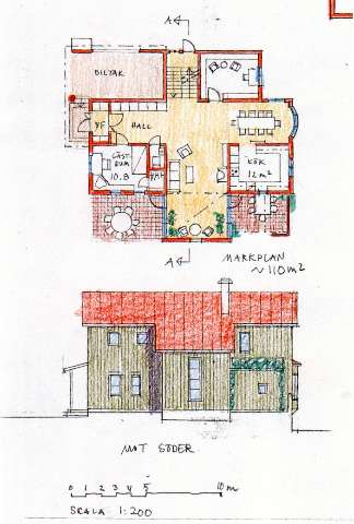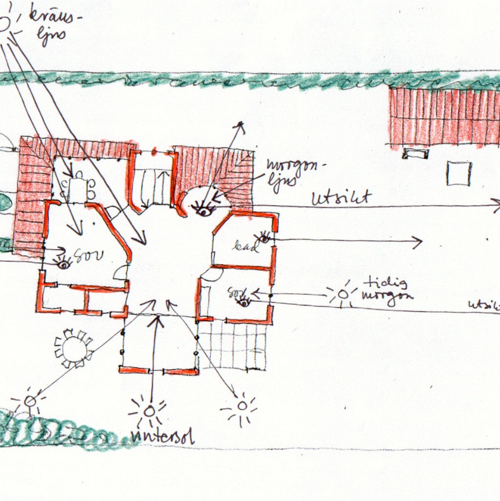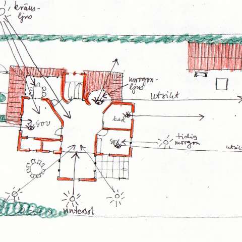 Kanske inte Feng-Shui, men det är mycket viktigt hur tomten ligger och hur man utnyttjar ljuset då man bygger hus. På bilden nedan ser du hur Gunda hade tänkt sig att man skulle utnyttja dagsljus och utsikten. Vi hade redan i planeringsskedet sagt att vi ville ha ljus och rymd.