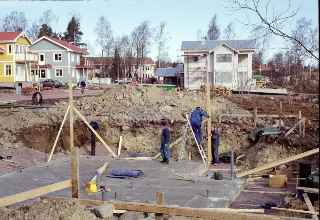 Ovan ser du hur byggarna reser jiggarna som skall gör att huset blir rakt.