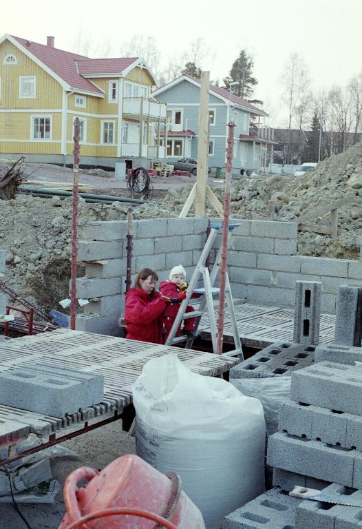 Cellar half-done and Grandma Ulla and Anni on the playground with construction site in the background.